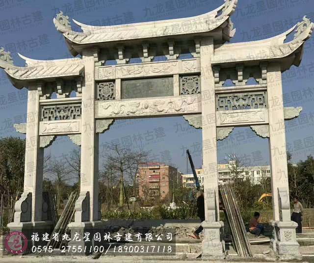牌坊集中了中國(guó)古建筑最有特征的構(gòu)件組成,有臺(tái)座、柱身(包括夾桿石)、梁坊、樓匾、斗拱、樓頂?shù)葮?gòu)件。石造牌坊材質(zhì)堅(jiān)固敦實(shí)牢靠,且可仿照木結(jié)構(gòu)造型。在藝術(shù)處理上,可以在夾桿石、柱子、額坊等處,雕刻各式各樣的花鳥(niǎo)、圖案、龍鳳及各種瑞獸等等,將中國(guó)傳統(tǒng)的石刻藝術(shù)集中于一身表現(xiàn)出來(lái)。中國(guó)民俗專(zhuān)家講:“石雕不開(kāi)光是石雕工藝品,開(kāi)光后就是具有靈氣的風(fēng)水神器。”所以“非寧?kù)o無(wú)以致遠(yuǎn),非精誠(chéng)無(wú)以神明。” 石牌坊是用石修建的牌坊,是一種裝飾建筑物。柱石的上方刻有麒麟、獅子,夾柱石的浮雕有雙獅戲彩珠,牌坊上還雕刻著其他怪獸云紋。兩側(cè)基石柱各有撐鼓,石柱兩側(cè)配有石獅。牌坊運(yùn)用浮雕、透雕等手法,是我國(guó)建筑藝術(shù)的一大特色。