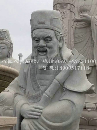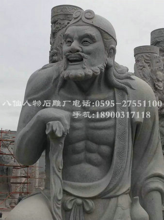 呂洞賓:頭戴瓦棱帽,攀身披道袍,腰系絲帶。身背青鋒劍,手執(zhí)拂塵,腳穿云頭靴,面目方正,留三綹長須,于道貌岸然中略帶幾分風流相。