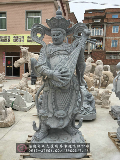 石雕東方持國天王.名多羅托,身著白色,穿甲胄,手持琵琶琴。用琵琶彈奏,使之缽依佛門,以音樂感化眾生護持國土。其職責是:保護東方國土,保護眾生,保護東方弗提婆洲人民。
