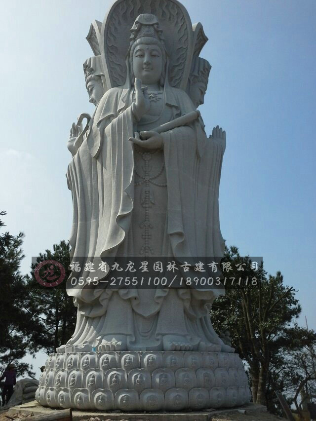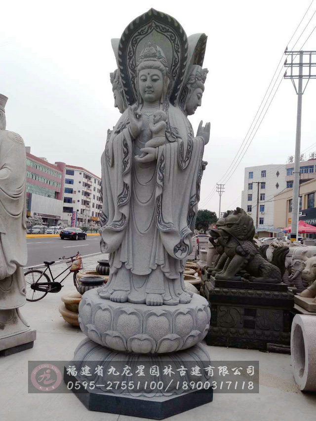 石雕三面觀音和石雕四面觀音相比,多出了一個面,分別正立于東南西北四個方向。東面觀音手持水瓶,象征著福音。南面觀音手持蓮花,象征和平和平安,西面觀音手持佛珠,象征著慈悲,北面觀音手持經篋,象征著智慧。石雕四面觀音像整體顯得莊重而慈悲。