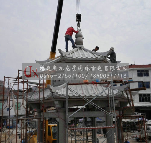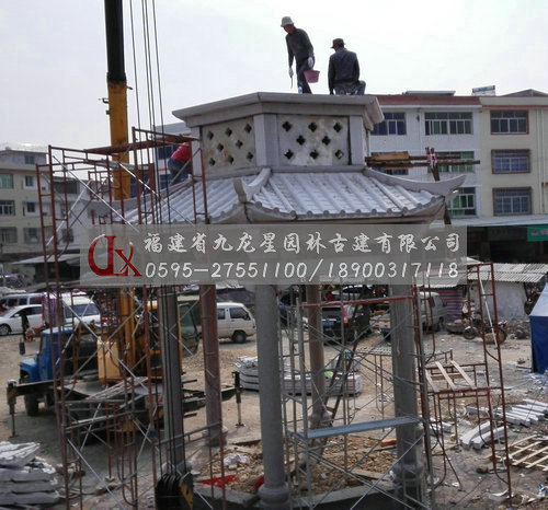 九龍星園林古建石材六角亭石亭子安裝現(xiàn)場