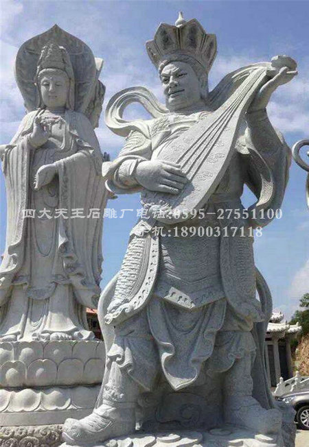 持國天王,梵名“提多羅吒”,佛教所說護世四天王之一,主守東方。據說他能護持國土,故稱作東方持國天。此天王居須彌山黃金埵,率領諸毗舍阇(顛狂鬼)等守護東方弗提婆洲。在四天王中,除了北方毗沙門天王之外,單獨作為供奉對象或作為佛教藝術表現的主題的情況很少,絕大多數場合是一起出現的。持國天王的形象,據《陀羅尼集經》卷十一中記,身著天衣,左手伸臂下垂持刀,右手屈臂向前,仰手,掌中托寶珠。另據《般若守護十六善神王形體》所說,持國天王身青色,紫發,面顯忿怒狀。著紅衣甲胄,手持大刀。中國內地佛教寺院中的持國天塑像,因受《封神演義》等民間神話影響,為一手持琵琶、身披中國式戰甲的武將形象。