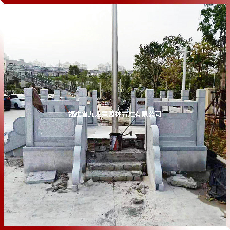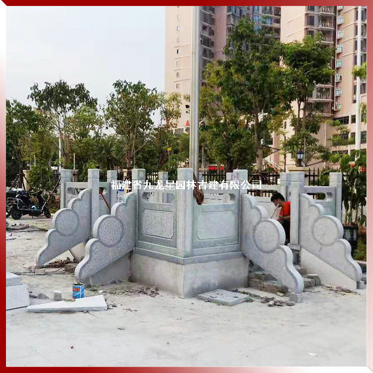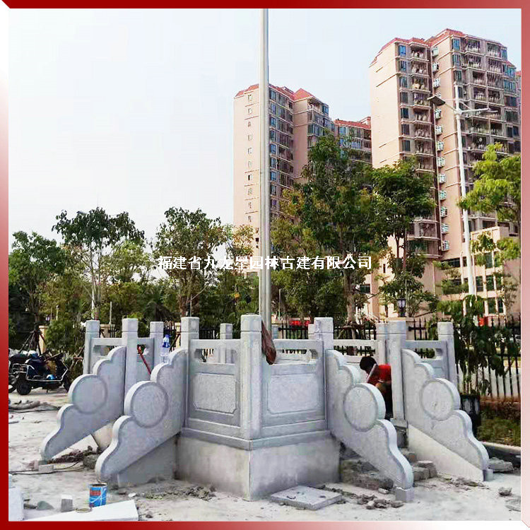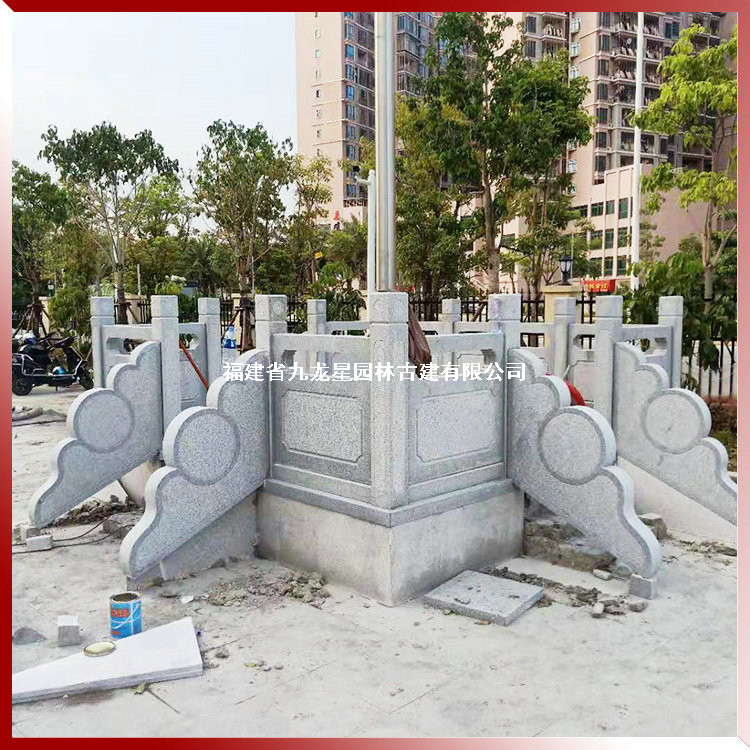 上圖石雕旗臺護欄,學校升旗臺石欄桿選用天然石材花崗巖生產(chǎn)加工,欄桿構(gòu)件有立柱、柱頭、欄板、抱鼓等幾部分組成,由九龍星園林古建制作安裝。