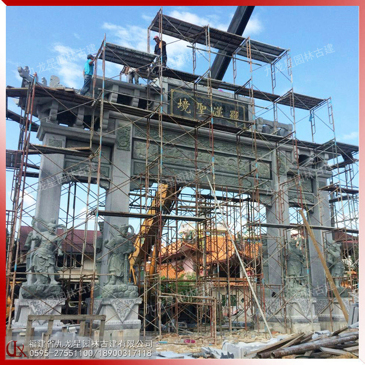 石牌坊定制 牌坊兩側(cè)雕刻護(hù)法神將大型山門(mén)石雕